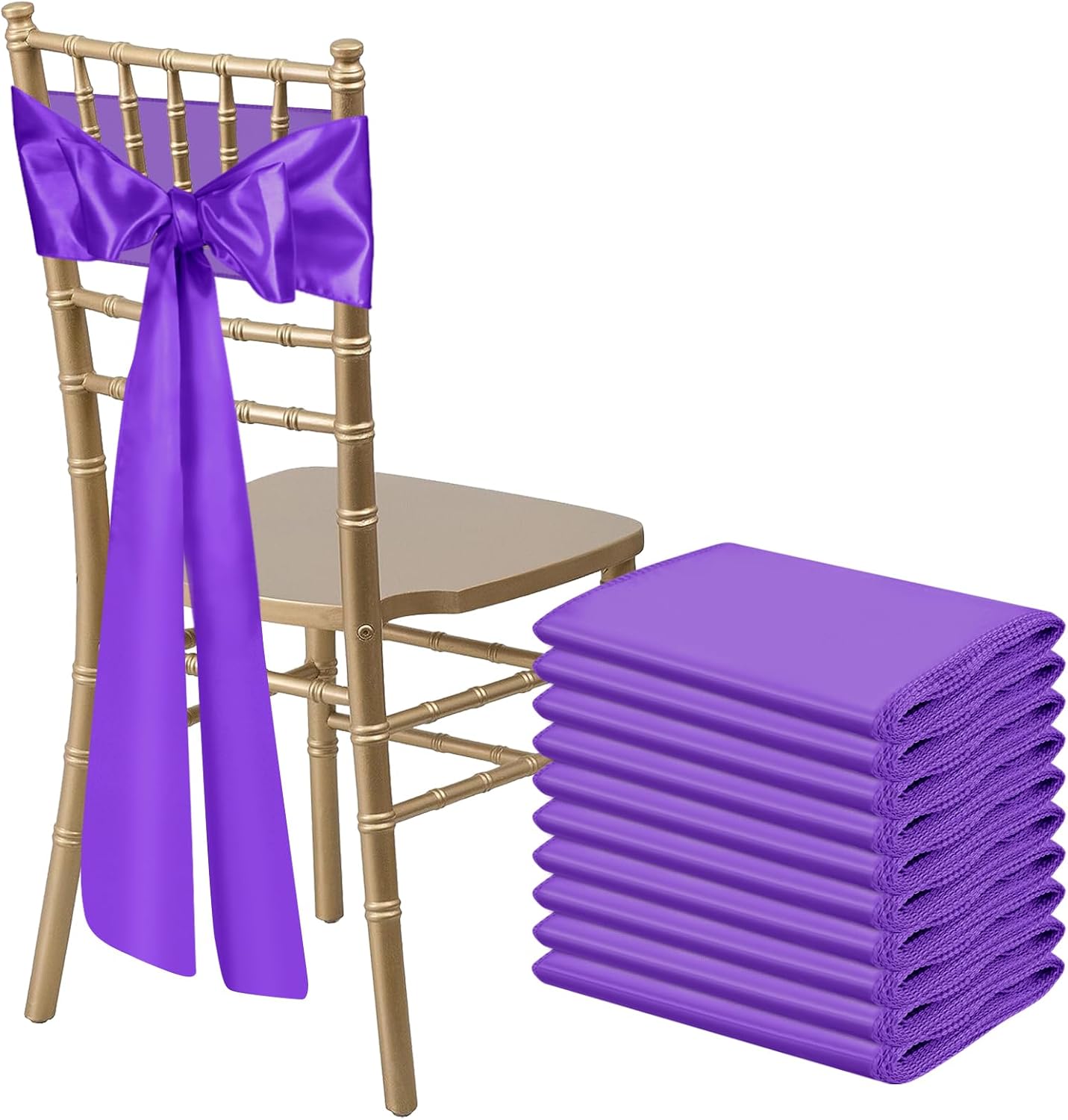 - Size & Package:You will get 10 pieces gold satin chair sashes, and the size is about 108" x7" or 275cm(l) x 17cm(w). These chair ties adopt flating packing, please to tie the bow by yourself. Each package includes chair sashes only, no chair covers