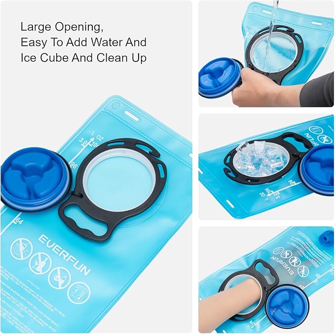 - EFFICIENT HYDRATION SYSTEM: This 18L hydration backpack includes an UPGRADED 100 oz / 3-LITER water bladder made of FOOD-GRADE PEVA material. The water Pouch has a Large Opening for easy refilling with water, ice cubes and cleaning. The high-flow bite valve is ergonomically designed for more comfortable use. The mouthpiece cover protects the bite valve against dirt and damage.