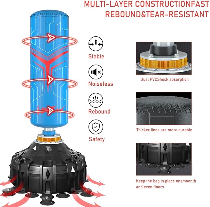 - 【Ultra Stable Base】Large size and non-deformable movable polypropylene base, which can hold 130lb of water or 200lb of sand, there are also 25 pcs suction cups, to provide stable support for the entire boxing bag. Sand is the better option to make it more stable.