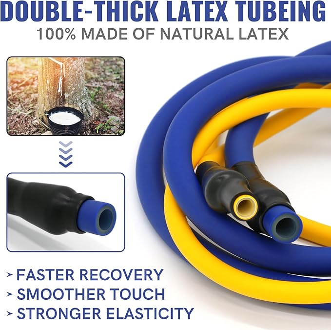- THE LATEST UPGRADED 150LBS RESISTANCE BANDS: Our resistance bands for working out are made of 100% healthy and environmentally friendly natural latex material, which have smoother touch, stronger resistance and better wear resistance! The exercise bands resistance have 5 different strength levels, corresponding to 5 different colors (cyan 10 lbs, blue 20 lbs, red 30 lbs, orange 40 lbs, purple 50 lbs), which can be used alone or stacked in any combination to a maximum equivalent of 150 lbs