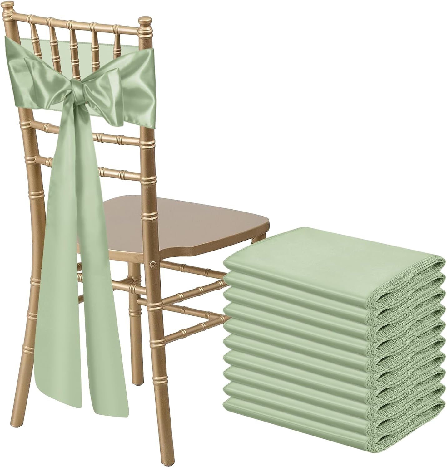 10 PCS Sage Green Satin Chair Sashes Bows Universal Chair Ribbon Ties Back Sash for Wedding Party Reception Events Banquets Hotel Event Chair Cover Decoration (7x108 inch)