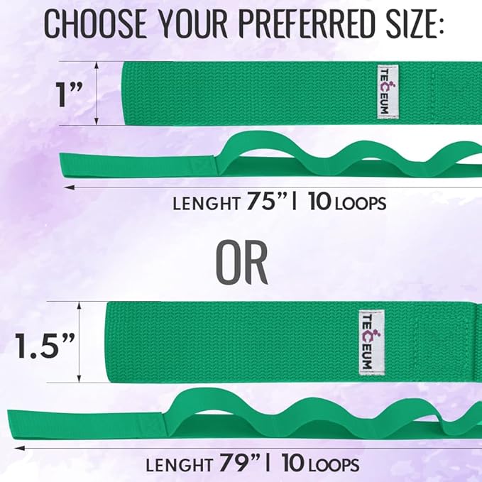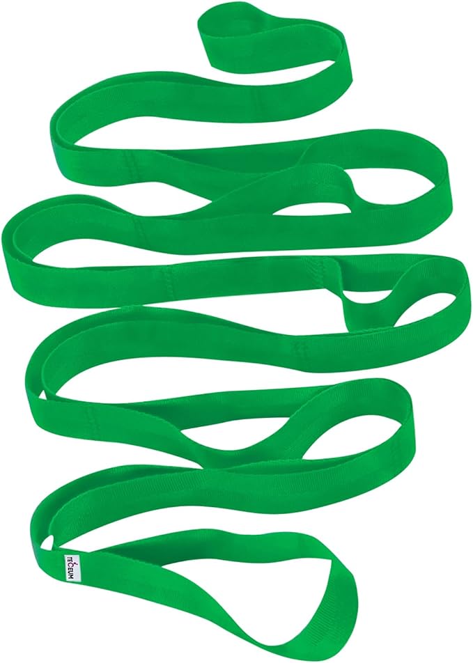 - STRETCHING STRAP. Color: GREEN. Material: POLYCOTTON. Width: 1.5 IN. Length: 79 IN. 10 Loops. Non-elastic. Superior Non-slip Grip.