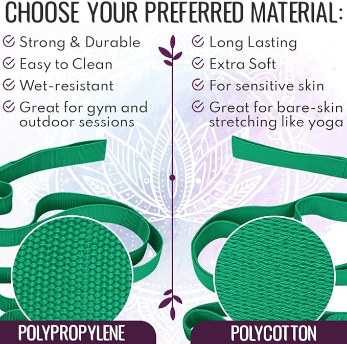 - STRETCHING STRAP. Color: GREEN. Material: POLYCOTTON. Width: 1 IN. Length: 75 IN. 10 Loops. Non-elastic. Superior Non-slip Grip.
