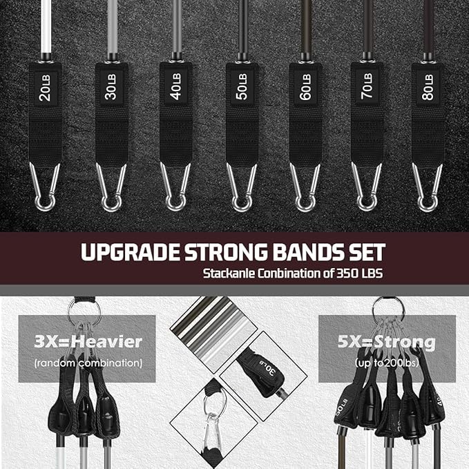 - Adjustable Resistance Bands, Maximum Equivalent of 350 lbs - Come as a set of 7, 48-inch long colored exercise bands. You can use the bands independently or in any combination with a maximum resistance level of 350lbs