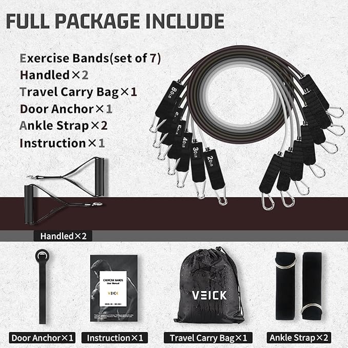 - What Are Included: 7 Tube Resistance Bands, 2 Soft Cushioned Handles, 2 Ankle Straps, 1 Door Anchor, 1 Exercise Guidance, 1 Carrying Bag