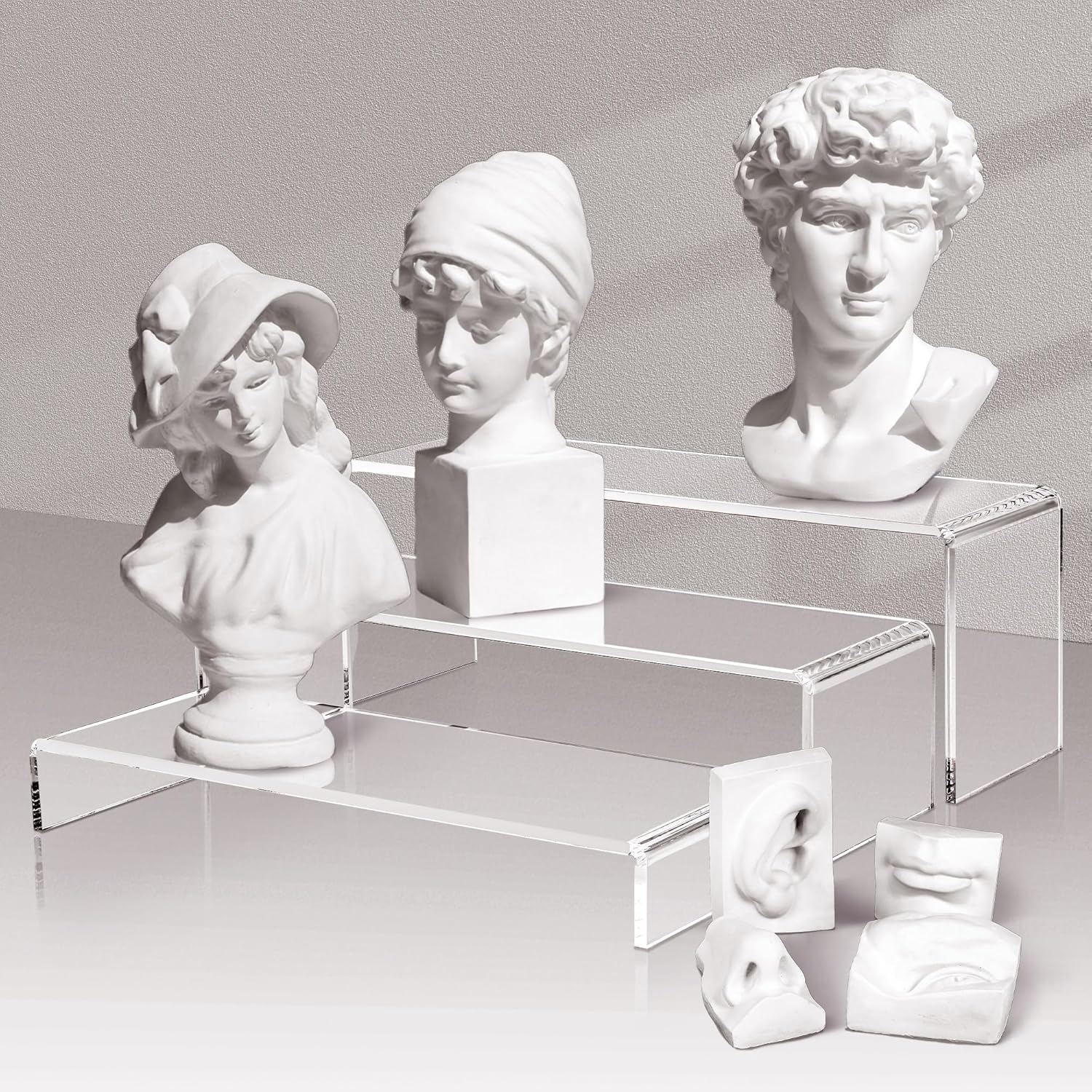 - 【MULTIPLE DISPLAY LAYERS】 Includes 3 pack of acrylic risers. Available in 3 different sizes (Small: 11" L x 4" W x 1.5" H, Medium: 11.5" L x 4" W x 3" H, Large: 12" L x 4" W x 4.5" H). 3 different heights can be displayed together like steps, or can be arranged individually or staggered. You can use your imagination and combine them freely. 4" width accommodates more and larger items