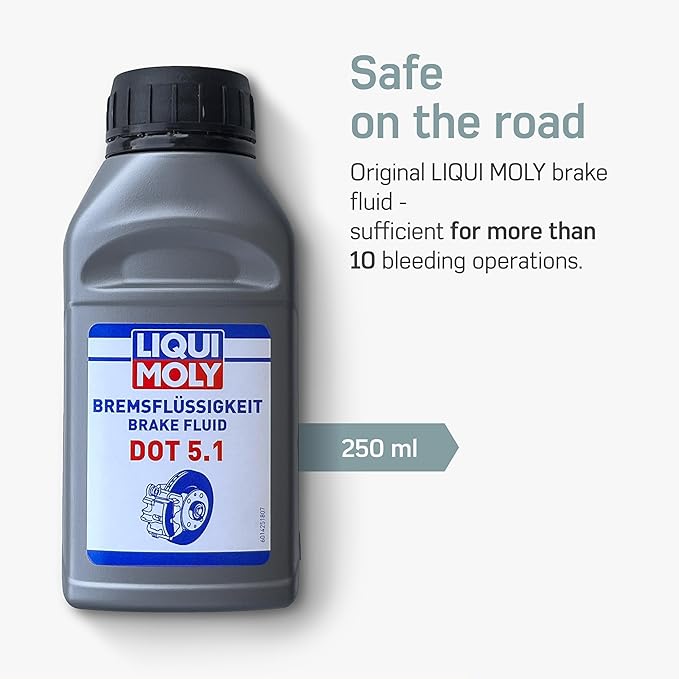 - COMPACT & CONVENIENT - Store all components of this hydraulic brake kit, including the syringe, bleed block, DOT 5.1 brake fluid, and adapters, in the practical box. The included Liqui Moly brake fluid is sufficient for multiple uses, making it a must-have brake bleeder kit.