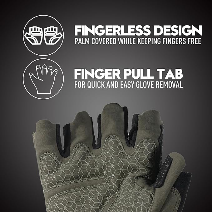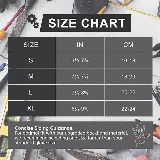 - Flexible Impact Resistant Half finger work gloves: TPR strong knuckle protection keeps your hand safe while working without limiting dexterity, keeps your hands warm while still being protected from scrapes and bruises, and also able to easily use a pen to write or handle small objects. Pull off easy with the built-in tabs along the fingers Concise Sizing Guidance: For optimal fit with our upgraded backhand material, we recommend selecting one size larger than your standard glove size.