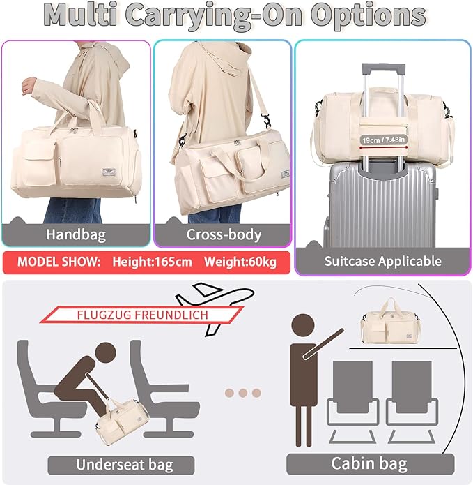 • : The size of this travel bag is 18''×11''×11'', ideal as a carry on bag. With additional adjustable shoulder strap & integrated trolley sleeve, the tote bag can be carried with you everywhere, making your travel a breeze