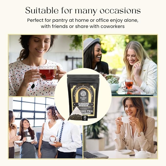 - Premium Jasmine Oolong Tea - Our handcrafted Jasmine Oolong Tea blends the floral elegance of jasmine blossoms with the rich, full-bodied flavor of high-mountain oolong tea leaves. Delicately scented with Natural Jasmine Essence and skillfully rolled, this tea offers a balanced, smooth taste that calms the senses and elevates your tea ritual.