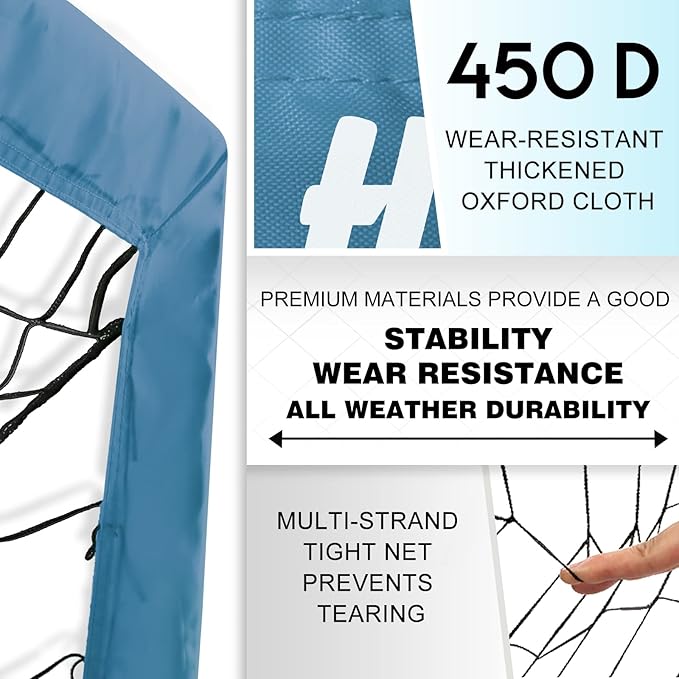- 【Long-lasting Thickened Material】 The soccer goal is made of 450D thickened oxford cloth, 10mm high elastic fiberglass pole and strong 3-layer polyester soccer net. This ensures exceptional performance even against powerful shots, maintaining its all-weather durability and it won't fade or wear even if it is placed outdoor for a long time.
