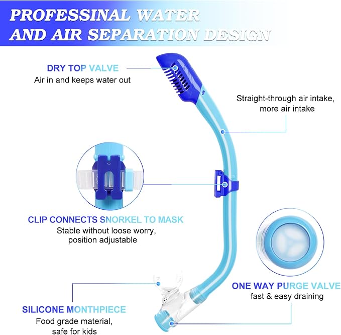 - 【DRY TOP SNORKEL & PURGE VALVE】The Snorkel adopts the most stable dry float valve design. When immersed in water, the top float valve will close automatically to prevent water from entering the breathing tube, the lower purge valve can quickly drain water, so that children will not be choked by water. Food grade soft liquid silicone mouthpiece is durable and safe for children to use.