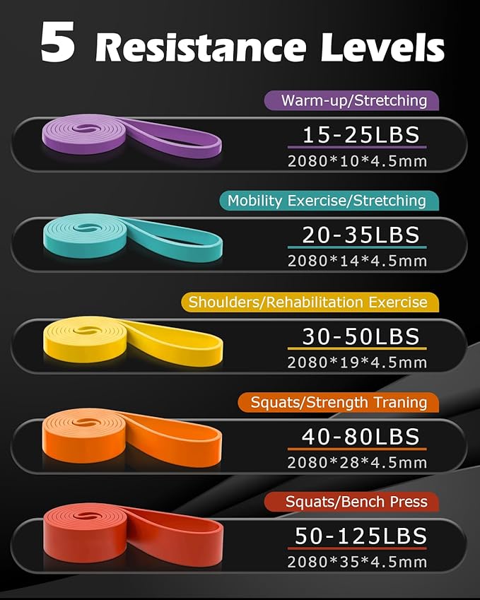 - 【Diverse Resistance Levels】: Explore our Pull Up Resistance Bands with 5 different color-coded bands, offering a distinct exercise bands resistance level: Purple (15-25 lbs), Cyan (20-35 lbs), Yellow (30-50 lbs), Orange (40-80 lbs), Red (50-125 lbs). Customize your workout by using a single band or combining multiple for increased challenge. Designed for individuals weighing 90 lbs to 300+ lbs