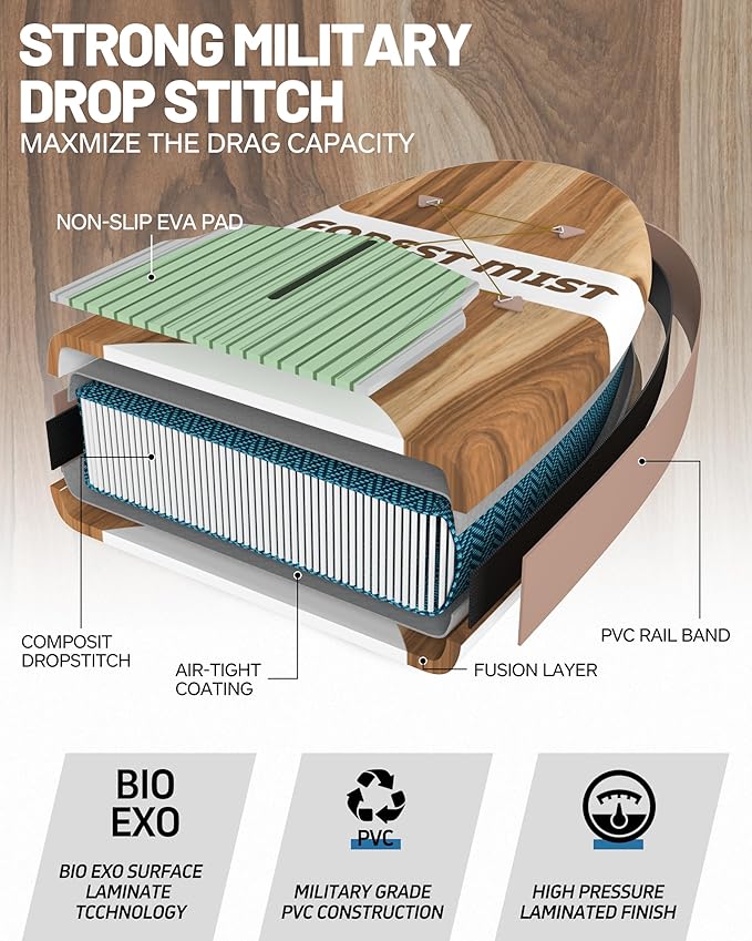 - 【Forest Mist Design & Premium Material】Quickly inflates and deflates for portability, you can carry to anywhere you dreamed for. Boierto use a High tech process to transform military-grade PVC into a rock-solid rigid platform. With a core of composite drop-stitch fibers connected to the nearly indestructible outer skin, the inflatable boards stand up to anything you want to do on the water