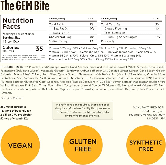 - MORE THAN ESSENTIALS: Beyond traditional multivitamins, GEM delivers science-backed nutrients like beta-glucan, prebiotics, and probiotics for holistic daily nutrition in one tasty bite. Supports overll wellness, Metabolism, Energy, & Endurance. Bite-sized, whole-body energy. One delicious, real-food Bite for holistic energy with underlying metabolic support. Packed with powerful ingredients like caffeine from green tea and ginseng root.