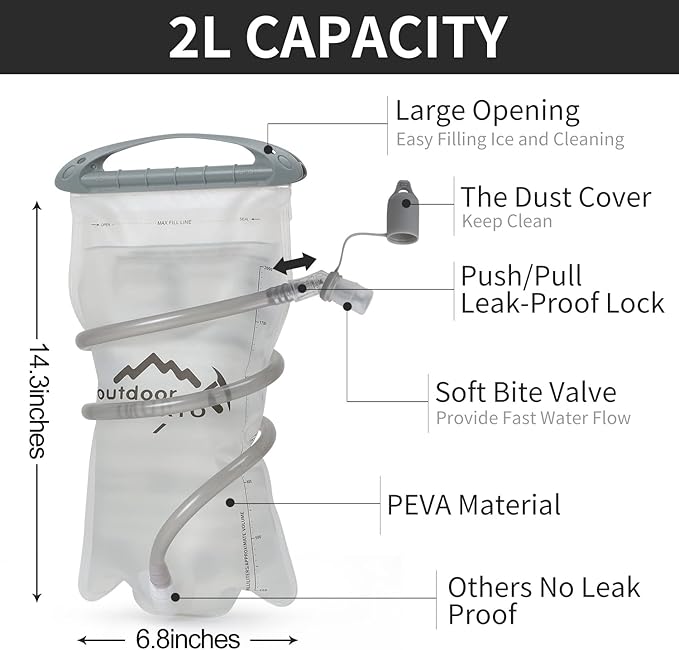 - 🚴【Premium Quality Water Bladder】The Hydration Pack Backpack comes with a 2 liter hydration water bladder and two 250ml soft flask. A switch valve and a cover cap make double leak-proof. Large opening allows quick filling of water and ice and it is easy to clean, the water line (40"length,0.4"diameter) provides a wholesome flow for easy drinking keeps your water tasting fresh, all day. The water temperature is range -20~+50℃.