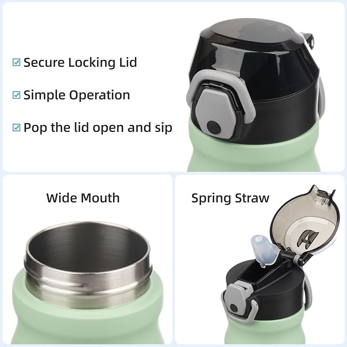- Equipped with a lockable flip lid and a spring straw, the bottle is leak-proof,left it in your bag without worrying any spills. Simple operation design ensures you Just pop the lid open and sip.Soft silicone spout makes a nice drinking experience.