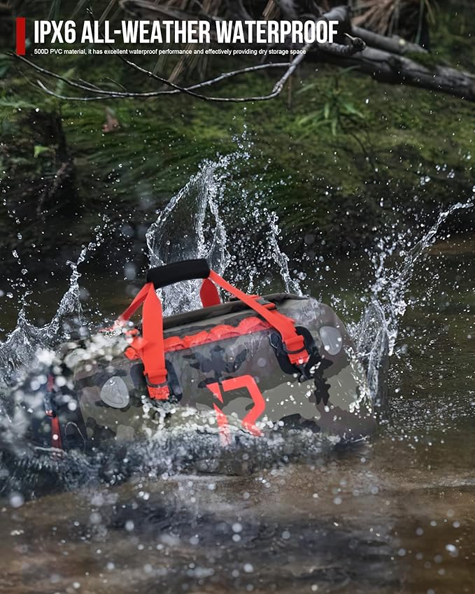 - 【Excellent waterproof property】Made with high-quality 508D PVC material, this bag features seamless sealing welding and a roll-top design that ensures complete protection against heavy rain. The Velcro closure at the top makes it easy to roll up and access your items quickly. This fabric withstands extreme temperatures, humidity, and UV exposure without cracking or deteriorating, making it perfect for long-distance travel. Your belongings will stay dry in any weather.