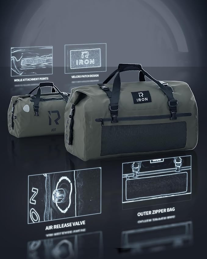 - 【Ample Capacity】This motorcycle tail bag comes in 30L, 50L, and 70L sizes, providing generous storage space. Internal pockets (30L fits a 15-inch tablet, while 50L and 70L fit a 26-inch tablet) and external mesh pockets offer extra storage options, helping you separate wet and dry items. Equipped with MOLLE attachment points for hanging keychains and water bottles, and an air valve to maximize capacity by releasing excess air.