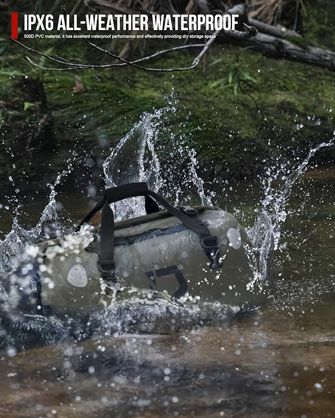- 【Excellent waterproof property】Made with high-quality 509D PVC material, this bag features seamless sealing welding and a roll-top design that ensures complete protection against heavy rain. The Velcro closure at the top makes it easy to roll up and access your items quickly. This fabric withstands extreme temperatures, humidity, and UV exposure without cracking or deteriorating, making it perfect for long-distance travel. Your belongings will stay dry in any weather.