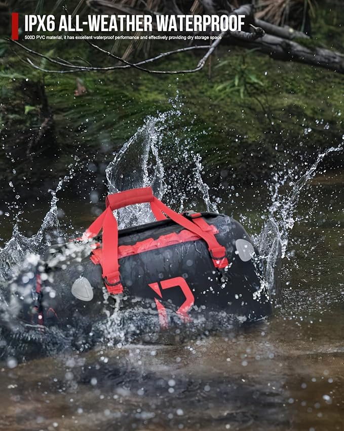 - 【Excellent waterproof property】Made with high-quality 513D PVC material, this bag features seamless sealing welding and a roll-top design that ensures complete protection against heavy rain. The Velcro closure at the top makes it easy to roll up and access your items quickly. This fabric withstands extreme temperatures, humidity, and UV exposure without cracking or deteriorating, making it perfect for long-distance travel. Your belongings will stay dry in any weather.