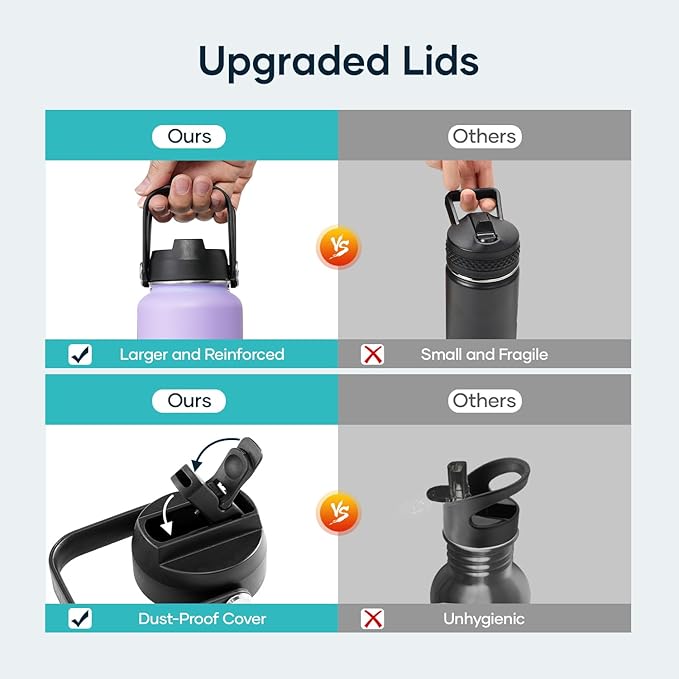 - 2 Lids to Max Its Usability: This stainless steel bottle comes with a straw lid and a flex cap to gear up your games and explorations. Both caps can seal airtight with 100% leak-proof, so you can drink without a spill on the road. *NOTE: ONLY the 22oz and 32oz T-shape bottles fit in any cup-holders*