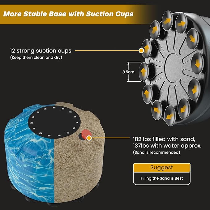 - Sturdy Floor Sucking Base: Rounded ABS base tank is engineered with a hole for filling sand or water (Weighs approx. 137 with water or approx. 205 lbs with sand) , includes 12 strong suction cups beneath to reduce base movement. We recommend filling with sand to ensure max stability