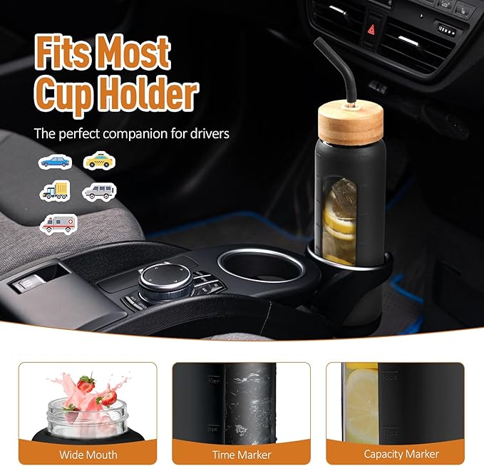 - WATER BOTTLE WITH TIME MARKER - The sleek, modern design coupled with the protective silicone cover makes our Kodrine glass water bottle a fashionable and functional accessory for any setting. The time marker and capacity marker on the sleeve are designed to help you stay hydrated and track your water intake throughout the day. The transparent body allows you to see the liquid level inside the bottle clearly, making it easy to stay on track with your hydration routine.
