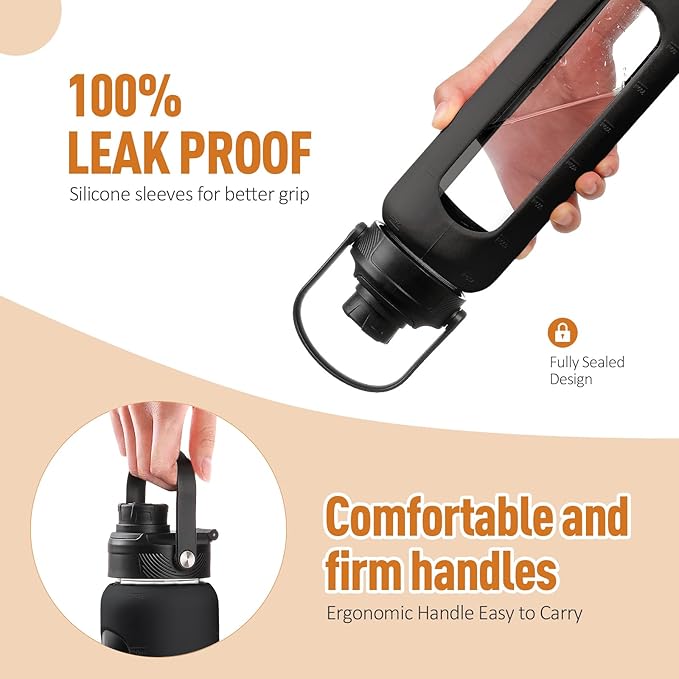- WHAT YOU'LL GET - Our daily water intake bottle set comes with a water bottle covered with a silicone protective sleeve, 1 bamboo lid plus 1 spout lid with handle, 2 straws(1 stainless steel and 1 tritan), and 1 straw cleaning brush. You can switch between the two lids according to the occasion and preferences. If there is any problem with your water bottle glass or the lid is damaged within 6 months, you can contact us at any time for a replacement.