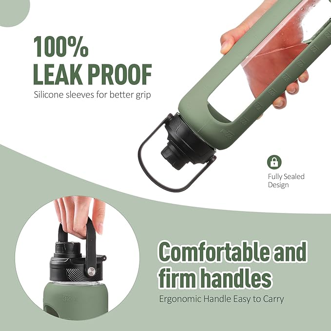 - WHAT YOU'LL GET - Our daily water intake bottle set comes with a water bottle covered with a silicone protective sleeve, 1 bamboo lid plus 1 spout lid with handle, 2 straws(1 stainless steel and 1 tritan), and 1 straw cleaning brush. You can switch between the two lids according to the occasion and preferences. If there is any problem with your water bottle glass or the lid is damaged within 6 months, you can contact us at any time for a replacement.