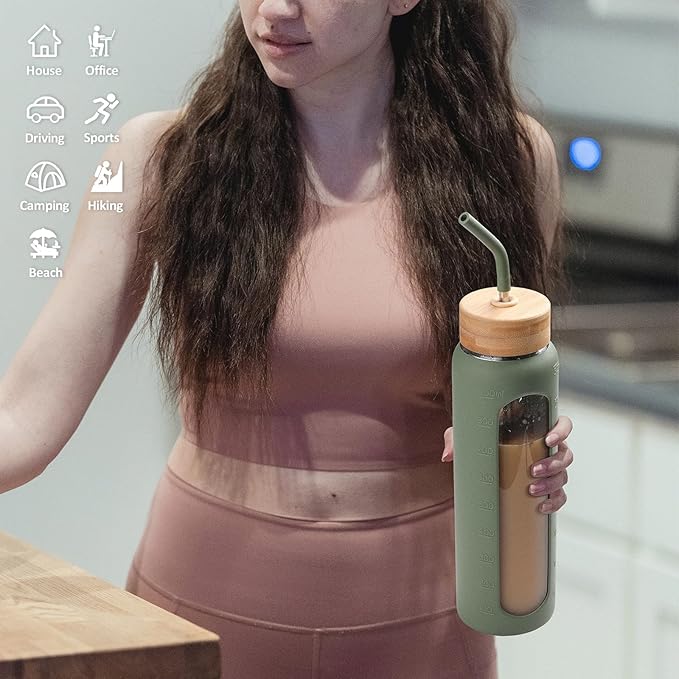 - 24 OZ AND 32 OZ VOLUME FOR OPTIONS - We have 2 sizes for those glass drinking bottles. The 32 oz glass water bottles are perfect for those who require a larger volume of water throughout the day. With this 32 oz bottle(1 liter water bottle), you can stay hydrated without the need for frequent refills. For those seeking a slightly smaller option, we offer the 24 oz glass water bottle, which is ideal for individuals who prefer a more compact and lightweight bottle.