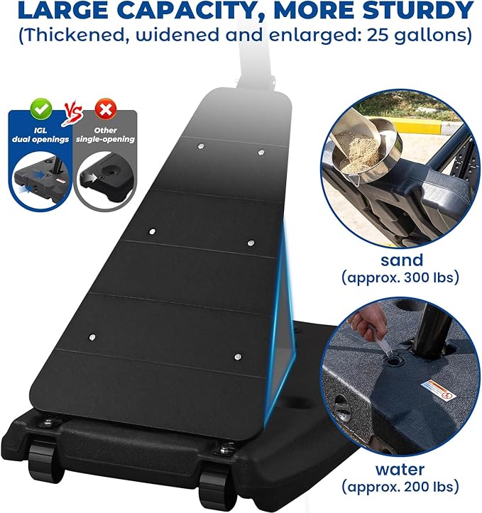 - 50 Inch Stable Base: The base dimensions measure 50 inches, with a filling capacity of 25 gallons (300 lb sand & 200 lb water). This provides a solid foundation, ensuring the basketball hoop remains steady and stable during use