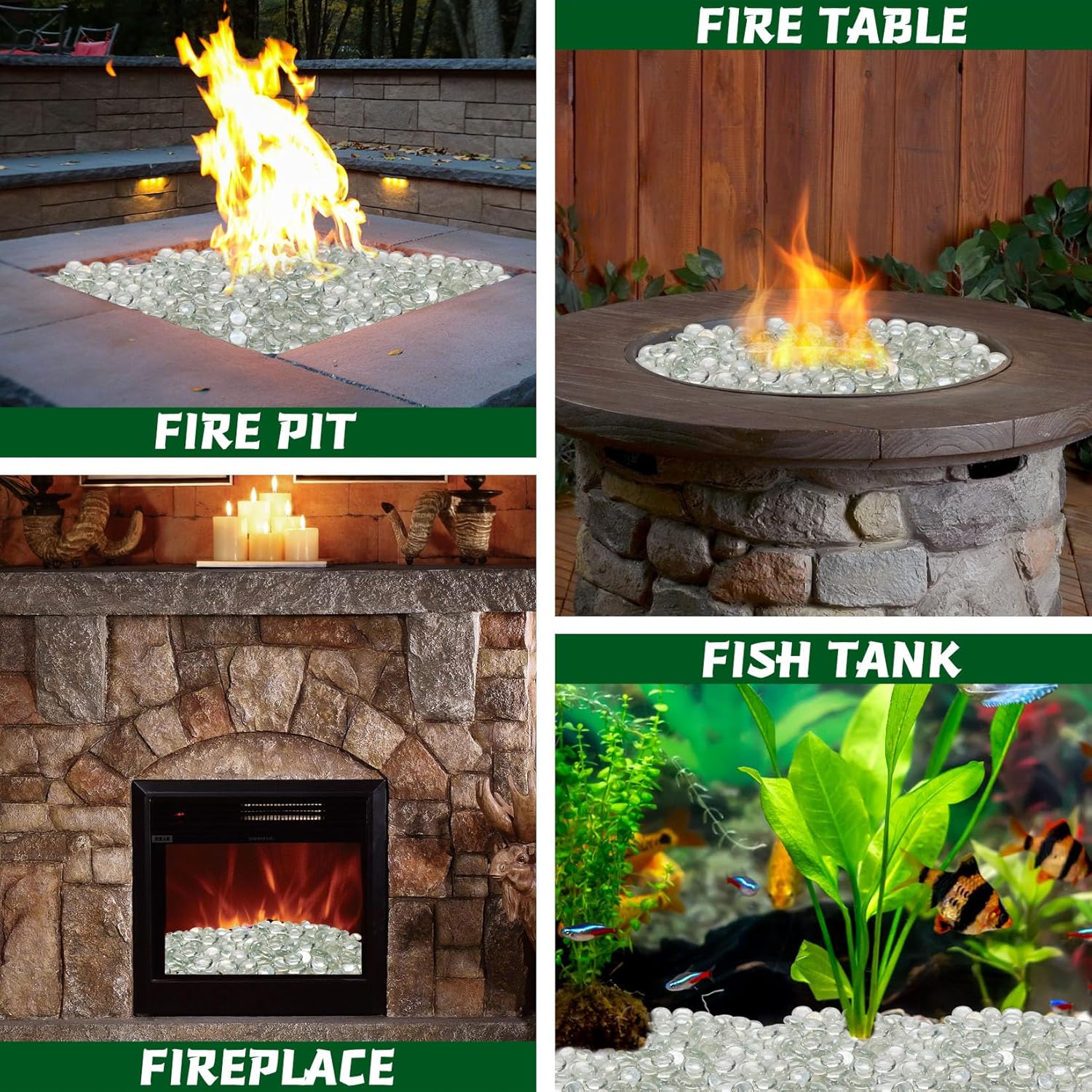 - 【Decorate Your Fire Pit】The fire glass dress up indoor and outdoor natural gas or propane fire pit and fireplace. Fire pit glass rocks are also an ideal addition to your garden, plant pots, fish tank and are used for crafts.