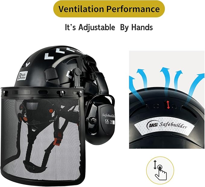 - 【Humanized Design】: SAFEBUILDER Work Hard Hat design is humanized, with multiple adjusting devices, which can adjust the size and depth of the Hat shell according to the size and contour of the workers' head,The Earmuffs with Adjustable Steel Leg to Fit well,Build In Visor together used with the mesh face Shield to get full face protection.