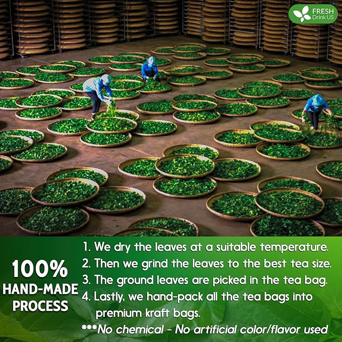 - ☘️ MULBERRY TEA BAS MADE BY A HAND-MADE PROCESS: Mulberry leaves are picked at their flavorful/colorful peak and naturally sun-dried to perfection. We hand-select only the premium leaves of Mulberry for the utmost quality. Then we grind the herbal leaves into the best tea size. Next, we immediately pack it in eco-friendly tea bags. Lastly, we pack the tea bags into food-grade kraft bags for ultimate freshness.