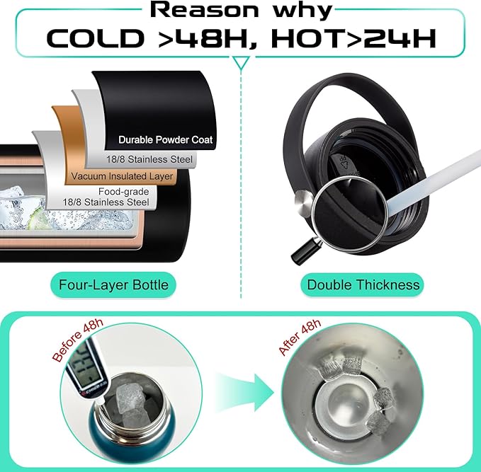 - QUALITY—Latest Vacuum Insulated: metal water bottle featuring double-wall & food-grade 18/8 stainless steel with superior insulation & anti-condensation, keeping your beverages stay ICE COLD for 48-Hours & HOT for 24-Hours for a fresh taste. In addition, the outer layer with non-slip powder coating ensures drinking bottles won't sweat & that keeps it from slipping