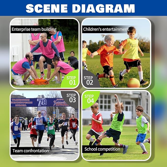 • 【Style Selection】---In order to meet the needs of different groups of people,our soccer training vests offer 4 color combinations(red+blue,yellow+blue,green+orange, red+blue+green+orange)and 3 types of quantity ratio(12pack/24pack/48pack) to choose from.