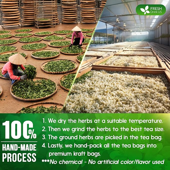 - ☘️ JASMINE GREEN TEA BAGS MADE BY A HAND-MADE PROCESS: Green Tea leaves are picked at their flavorful/colorful peak and naturally sun-dried to perfection. We scent the Green tea leaves by Jasmine flowers for the utmost quality. Then we grind the herbal leaves into the best tea size. Next, we immediately pack it in eco-friendly tea bags. Lastly, we pack the tea bags into food-grade kraft bags for ultimate freshness.