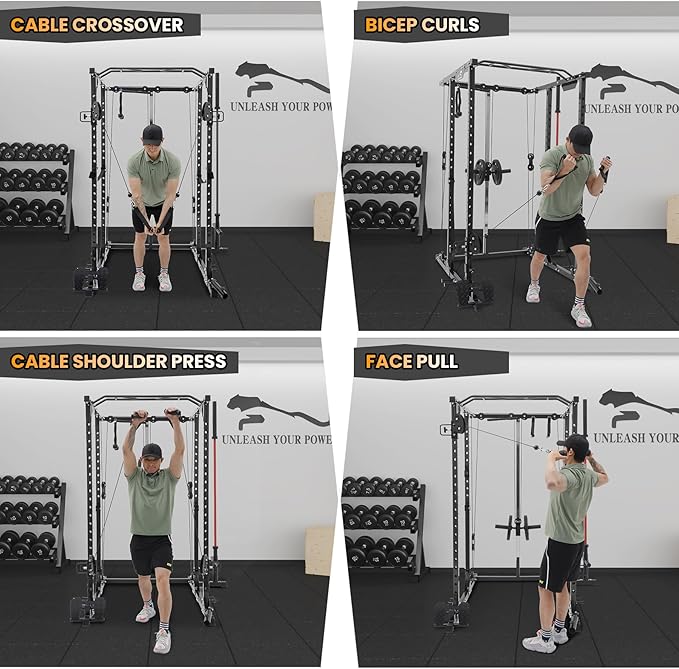 - ENDLESS TRAINING POSSIBILITIES: No home or garage gym should be without a power rack. Our power cage can bring power rack, cable Cross-Over machine, lat pulldown station, low row station (includes footplate attachment), chin station, dip station, core trainer, landmine station to your home gym at the same time. You can train your full-body with just one device. It can be used by multiple family members at the same time, making it perfect for your home gym.