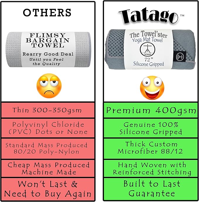 - Lots Of Grip, While You Drip: Tatago hot yoga mat towel non slip grip for covering your yoga or pilates mat during practice. The yoga towel non slip silicone gripped backside, & soft and absorbent microfiber blend ensure your hot yoga towel won't skid or bunch up during practice.