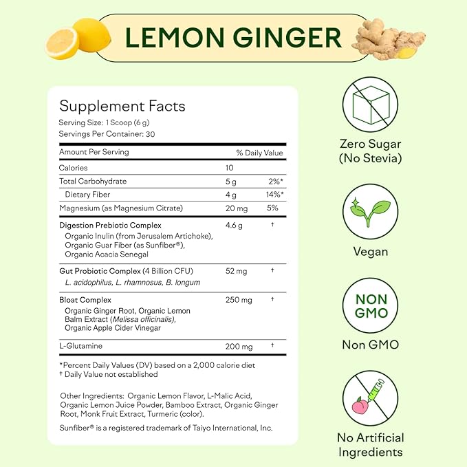 Feel Goods Gut Guardian, Organic Fiber, Probiotic & Prebiotic Powder, Sugar Free, Herbs for Bloat, Gut Health Support, Digestive Health for Men & Women, Non GMO, Vegan, Lemon Ginger, 30 Servings