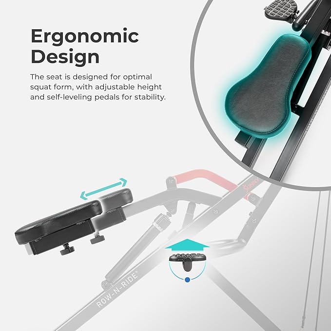 - 【INTENSE FULL-BODY SQUATS】Designed for precision, the Row-N-Ride PRO incorporates resistance bands and an innovative design to amplify your squat exercises, activating both your glutes and arms for an effective total-body workout.