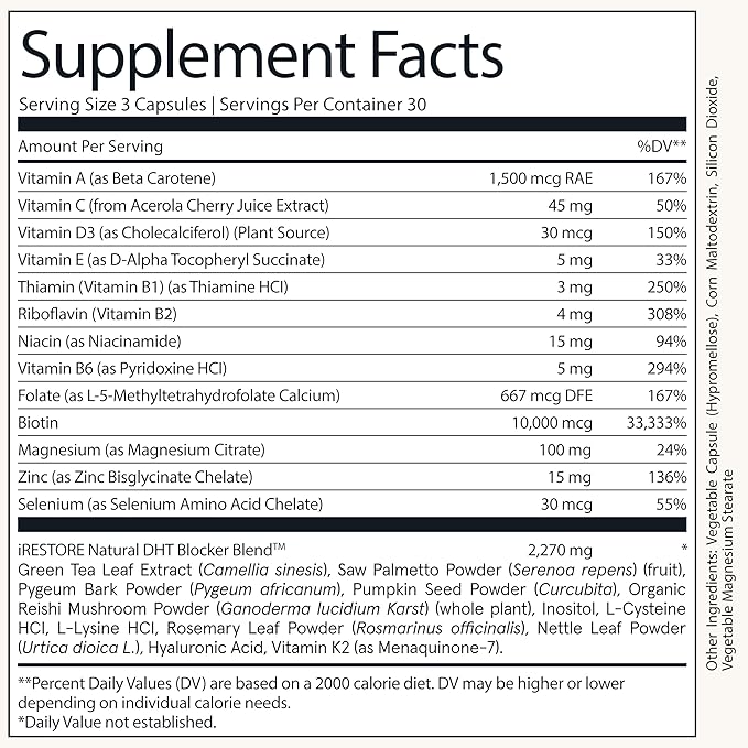 iRestore Hair Growth Supplement – Natural DHT Blockers & Multivitamin Blend – Vegan, Non-GMO, 90 Capsules – Supports Thicker, Stronger Hair for Men and Women – 3-Pack