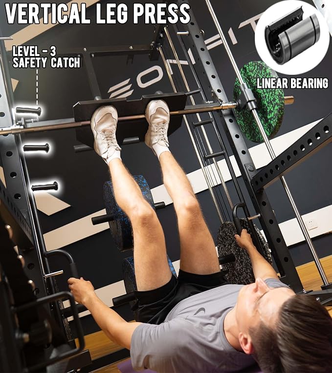 - 【11-In-1 Home Gym Station】E5 smith machine combines Power Cage/Functional Trainer/Cable Crossover/Two Lat Pull down Station/ Smith Machine /Vertical Leg Press/Chin Station /Dip Station /Core trainer/Landmine Station /Suspension Trainer. The guide rails (premium solid steel) deliver ultra-smooth movement with bearings during the workouts, as well as safe lock and release mechanics and safety arms allowing the users to max out their training safely