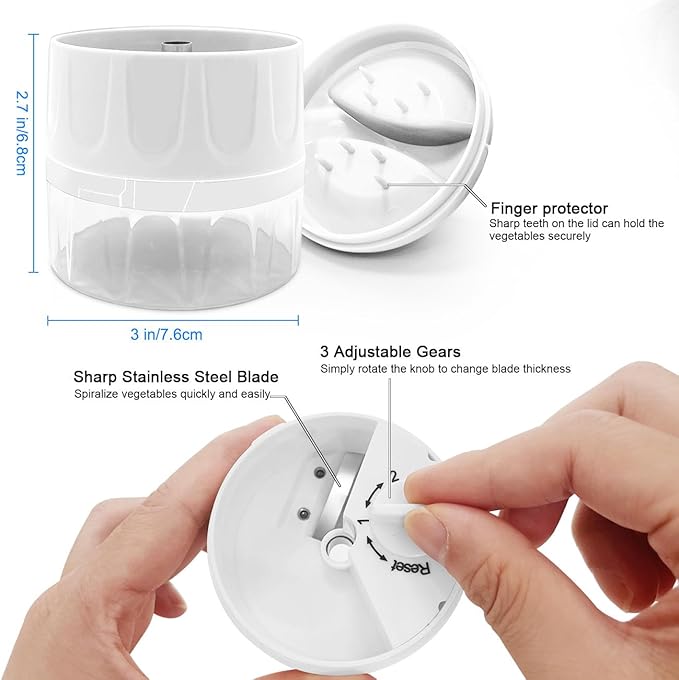 - HIGH QUALITY MATERIALS-The blade of spiralizer is made of high quality stainless steel. Due to its compact size, it takes up minimal space and fits comfortably in the hand for precise and safe cutting.
