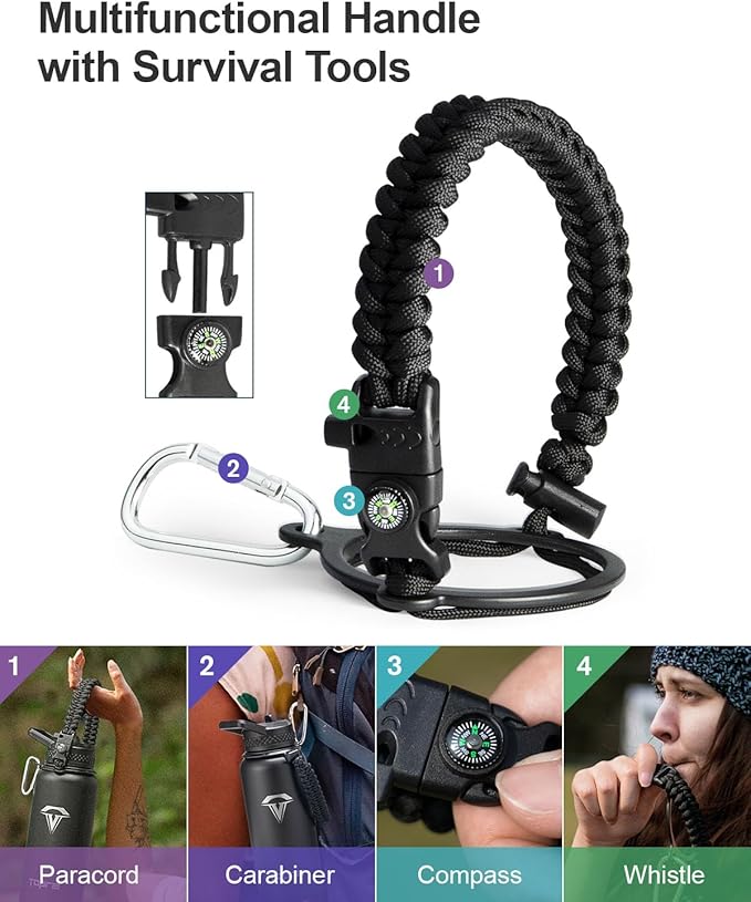 - Ready for adventures: Topre 32oz water bottles include a paracord handle,it is crafted from sturdy braided rope with an attached survival kit. This includes a compass, a whistle, and a clip, making it an ideal companion for any outdoor activity — be it camping,hiking or exploring new places through travelling.