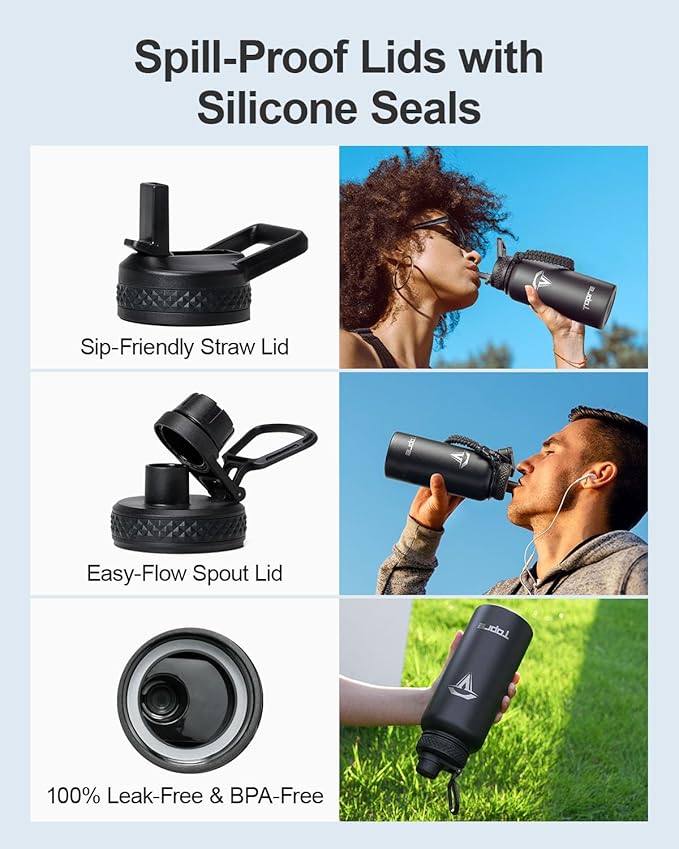 - 100% Leak-Proof: Topre 32oz stainless steel water bottles includes two lids—a straw lid and a spout lid. Both are equipped with silicone rings to prevent any spills or leaks, and are completely BPA-free for your peace of mind.