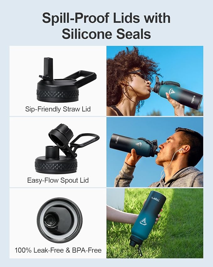 - 100% Leak-Proof: Topre 40 oz stainless steel water bottles includes two lids—a straw lid and a spout lid. Both are equipped with silicone rings to prevent any spills or leaks, and are completely BPA-free for your peace of mind.
