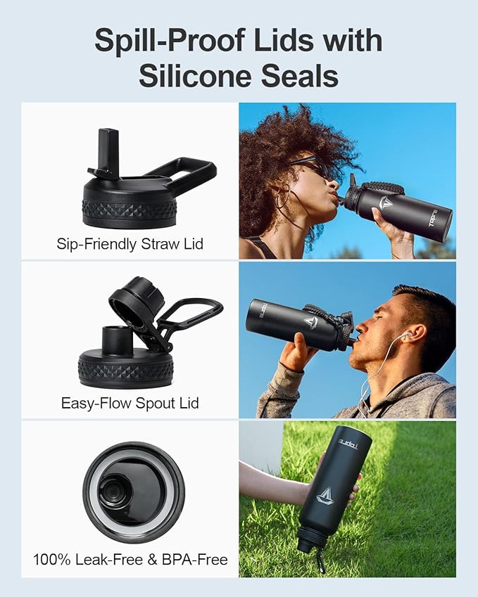 - 100% Leak-Proof: Topre 40 oz stainless steel water bottles includes two lids—a straw lid and a spout lid. Both are equipped with silicone rings to prevent any spills or leaks, and are completely BPA-free for your peace of mind.