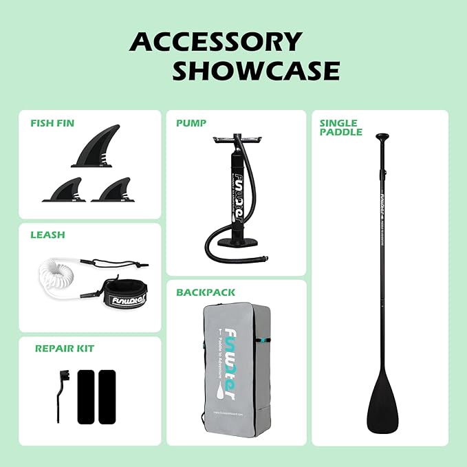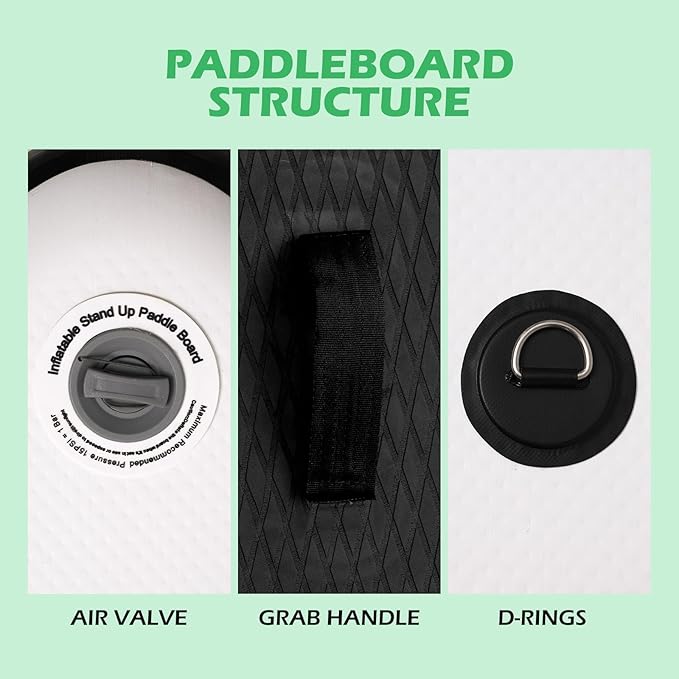 - 【Package Including】1×inflatable paddle board, 1×adjustable sup paddle ,3×fins , 1×sup pump , 1×backpack , 1×leash